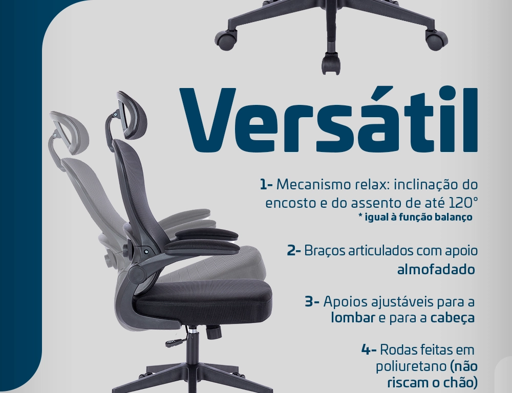 – Possui função relax (balanço) que permite a inclinação do encosto e do assento em até 120°.