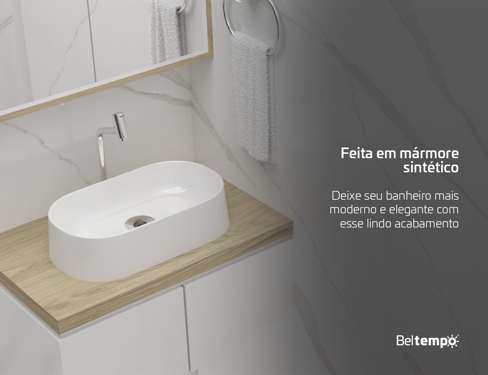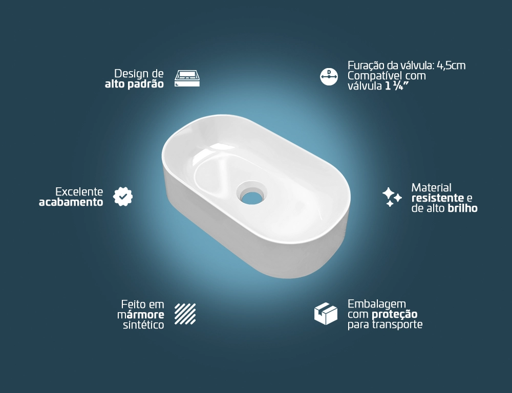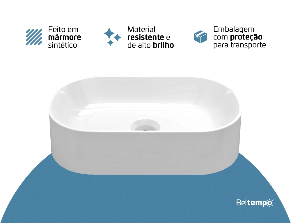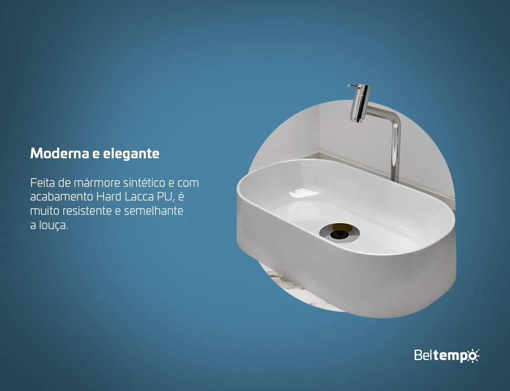 Fabricada em mármore sintético resistente e de longa durabilidade, seu acabamento é polido brilhante. A instalação é normalmente realizada sobre o móvel (gabinete, armário ou bancada), mantendo toda a cuba aparente (cuba de apoio).