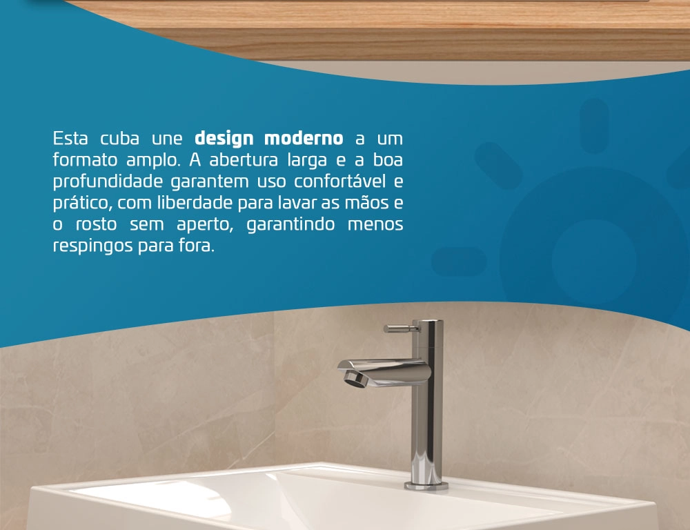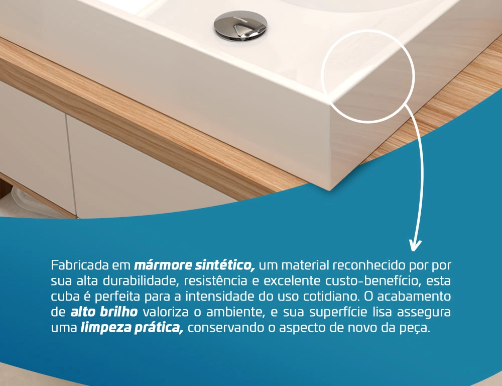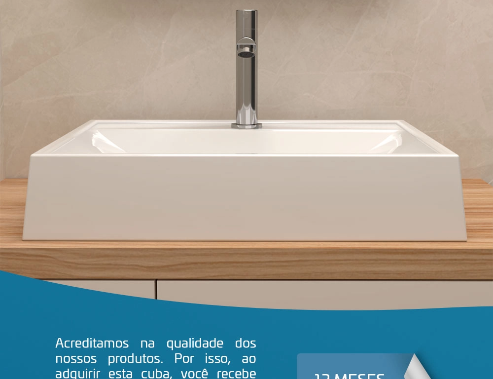 INFORMAÇÕES TÉCNICAS – Modelo: Coral BT-2171 – Formato: Retangular – Tipo de cuba: Apoio – Material: Mármore sintético – Revestimento: Polido – Acabamento brilhante: Gel Coat – Cor: Branca