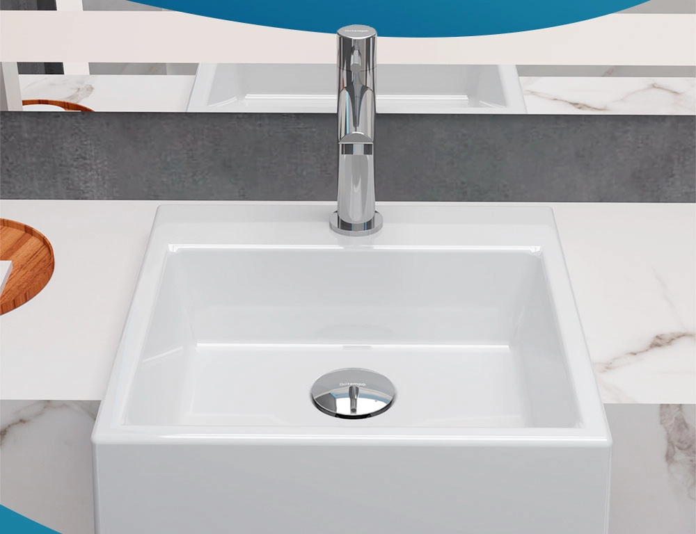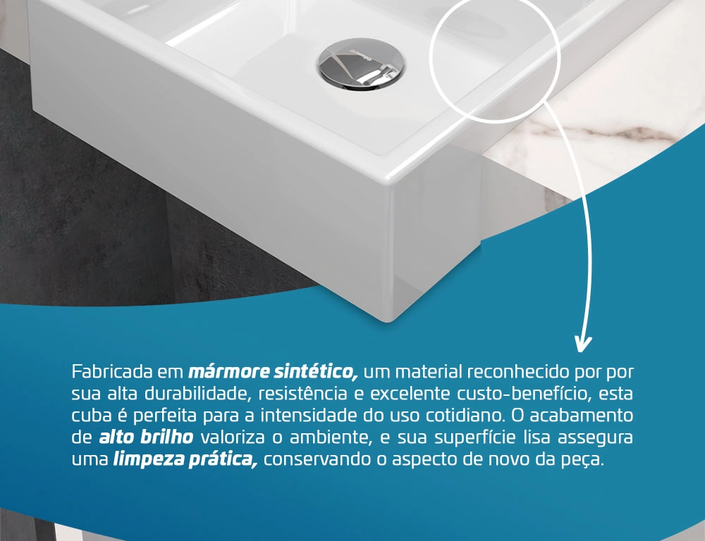 INFORMAÇÕES TÉCNICAS – Modelo: Rubelita BT-3103 – Formato: Quadrada – Tipo de cuba: Semi encaixe – Material: Mármore sintético – Revestimento: Polido – Acabamento: Hard Lacca Pu – Acabamento brilhante: Gel Coat – Cor: Branca