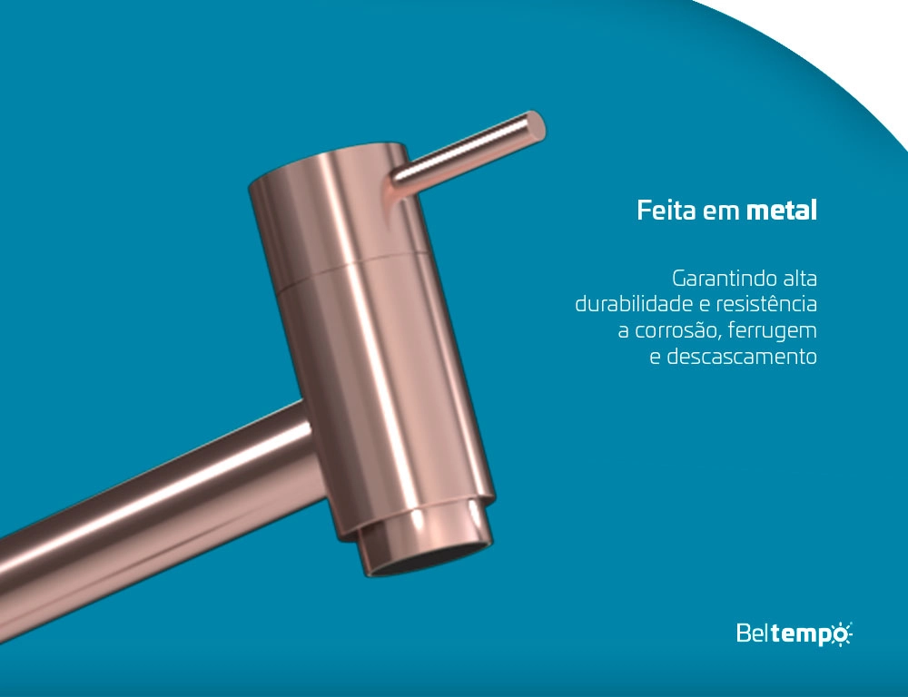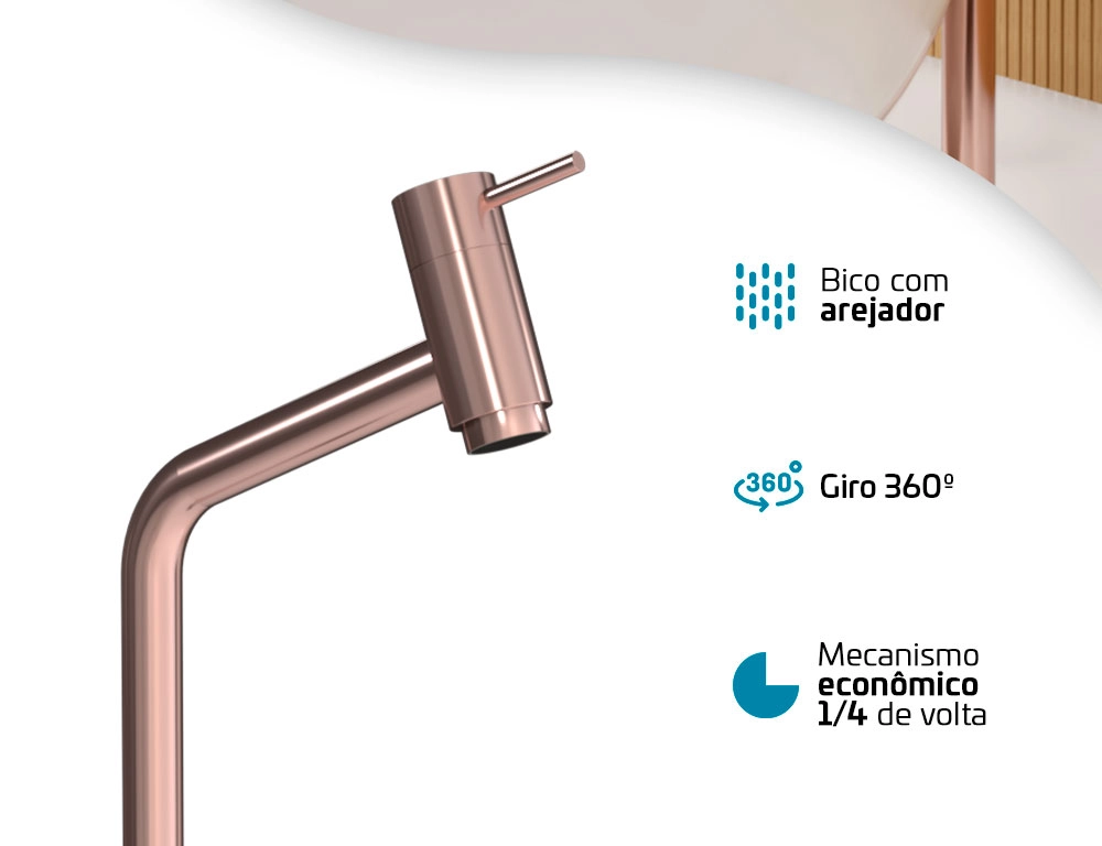 INFORMAÇÕES TÉCNICAS: – Marca: Beltempo – Linha: Classic – Modelo: TBA-CL-L-RG – Tipo: Mesa Link Bica Alta – Acionamento: Manual 1/4 de volta – Material: Metal – Acabamento/cor: Rose Gold – Bica móvel com giro 360°. – Bitola da rosca de entrada de água: G ½’’ – Água fria. – Arejador: Sim – Acompanha: Canopla, rosca de fixação e anel de vedação. – Uso Indicado: Banheiro, Lavabo, Cozinha, Pia, Cuba, Lavatório, Área de gourmet Área de serviço, etc.