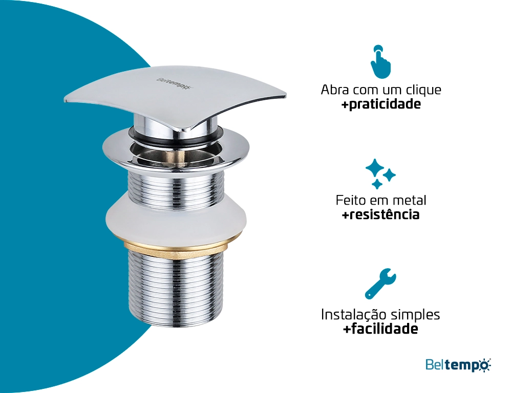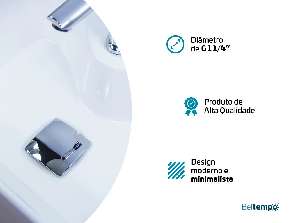 A Válvula Click Quadrada 1 1/4″ Prestige Beltempo combina praticidade, durabilidade e um design moderno para completar seu lavabo ou banheiro com estilo. Ideal para cubas e pias, é uma escolha inteligente para quem busca funcionalidade sem abrir mão da sofisticação.
